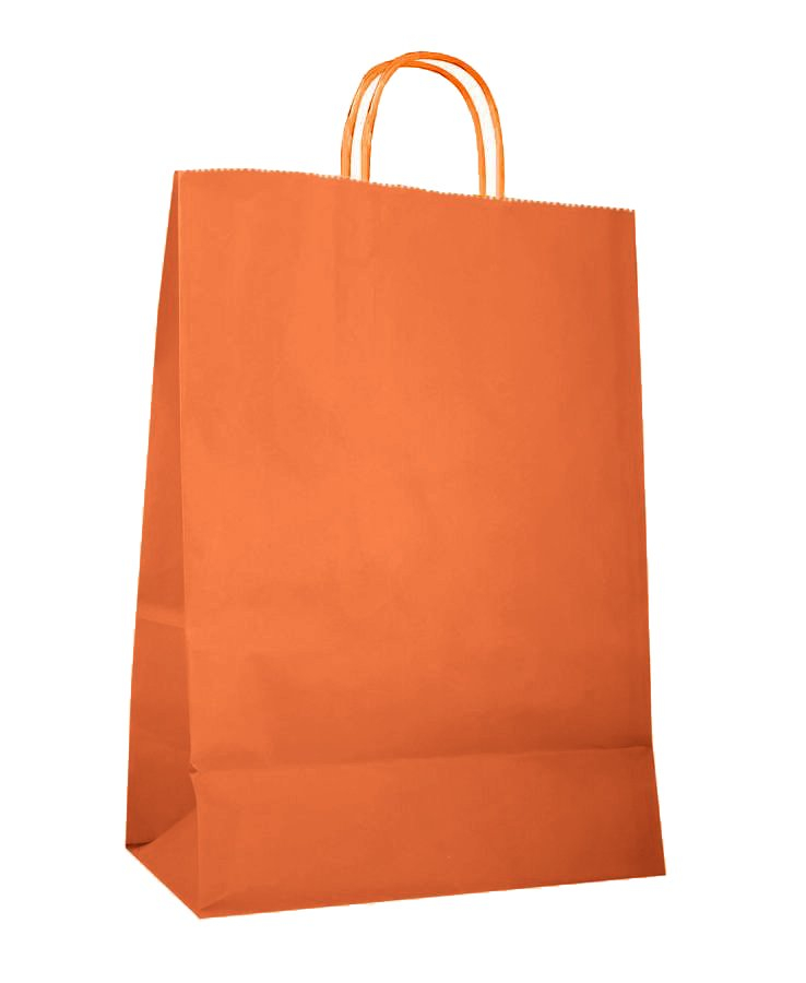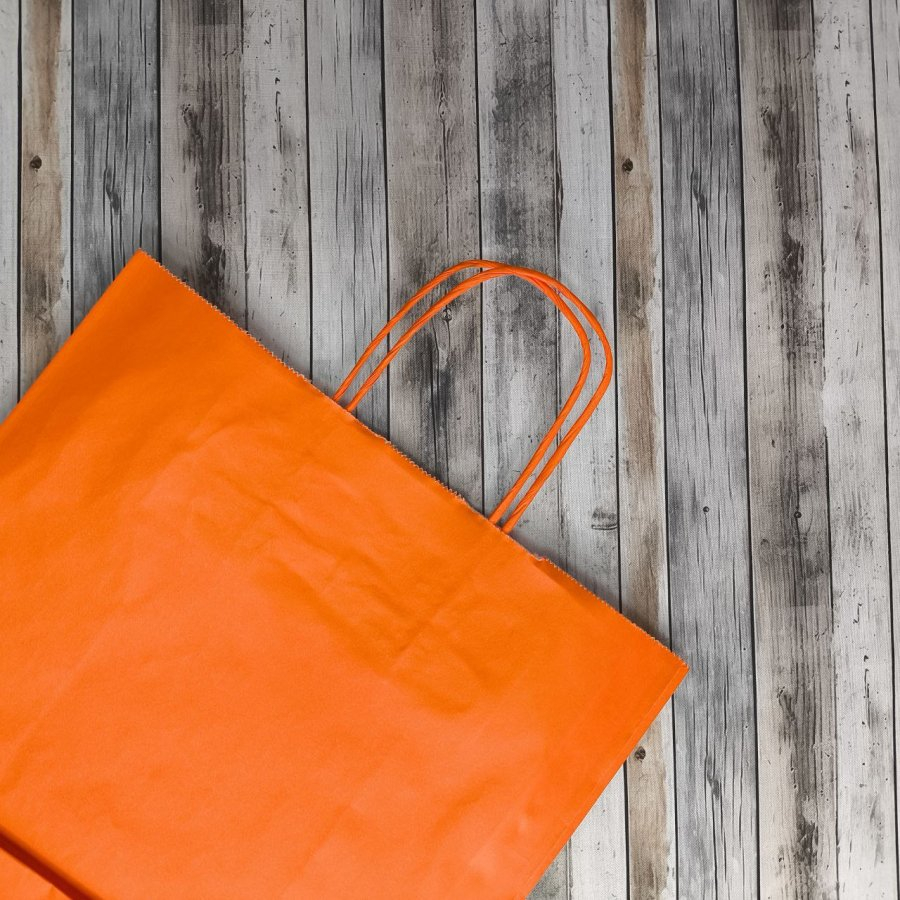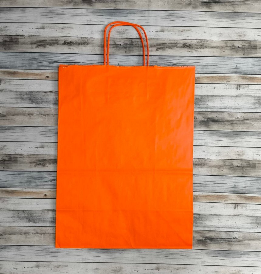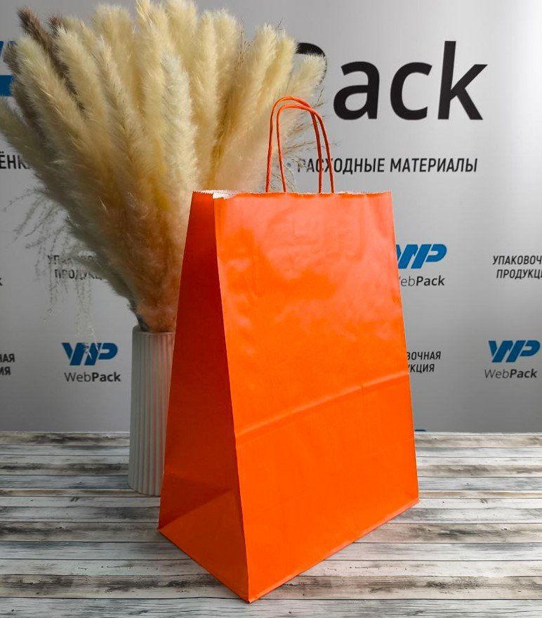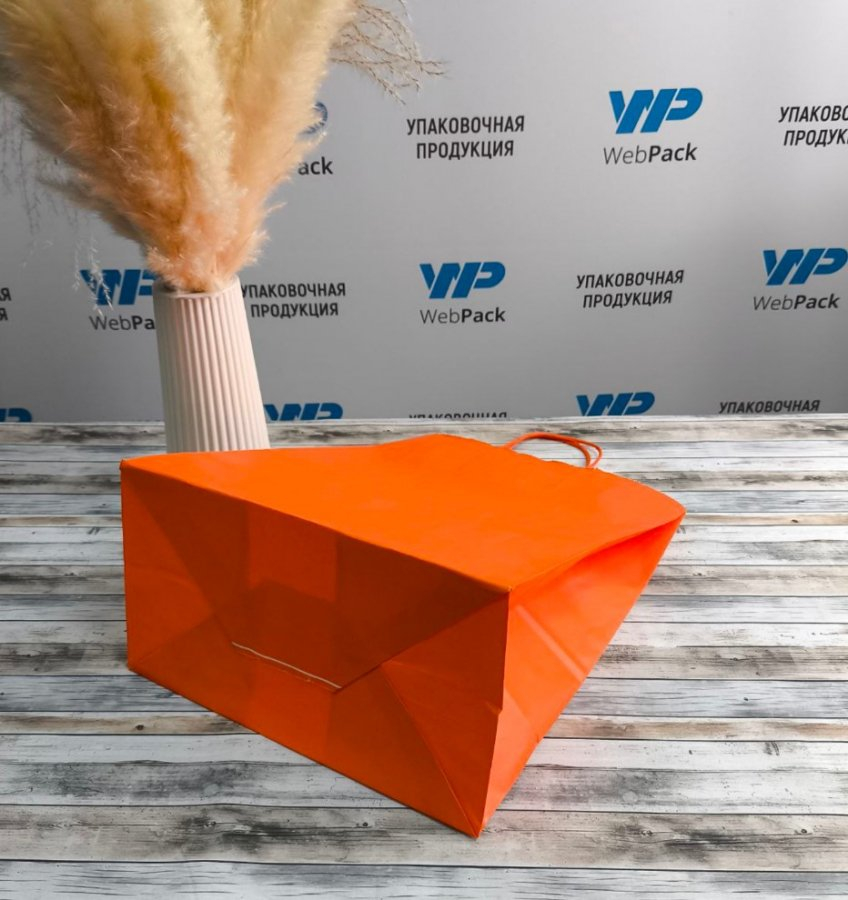 - Бумажные крафт пакеты оранжевого цвета с кручеными ручками, размер 26x15x35 см.