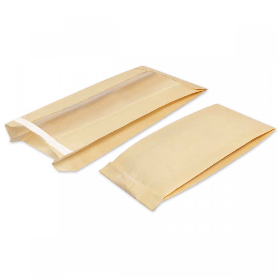 - Крафт-пакеты 110x40x260 мм с прозрачным окошком шириной 50 мм, V-образным дном и клеевым клапаном. Изготовлены из бумаги бежевого цвета плотностью 40 г/м2.