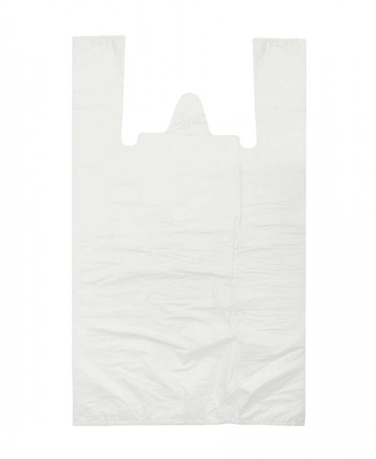 Пакеты-майка белого цвета, размер 30x50 см, толщина 15 мкм. Есть боковые фальцы. Используются в магазинах и супермакетах для упаковки различных товаров (одежды, обуви, техники, канцелярии и др.).