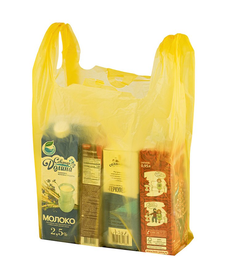 Пакеты-майка желтого цвета, размер 30x50 см, толщина 20 мкм. Есть боковые фальцы. Используются в магазинах и супермакетах для упаковки различных товаров (одежды, обуви, техники, канцелярии и др.).