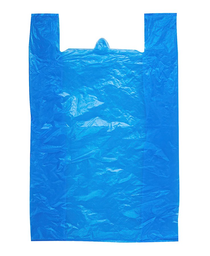 Пакеты-майка синего цвета, размер 50x80 см, толщина 23 мкм. Есть боковые фальцы. Используются в магазинах и супермакетах для упаковки различных товаров (одежды, обуви, техники, канцелярии и др.).