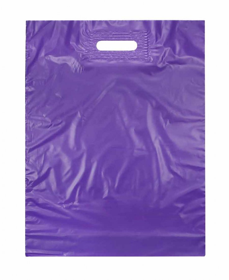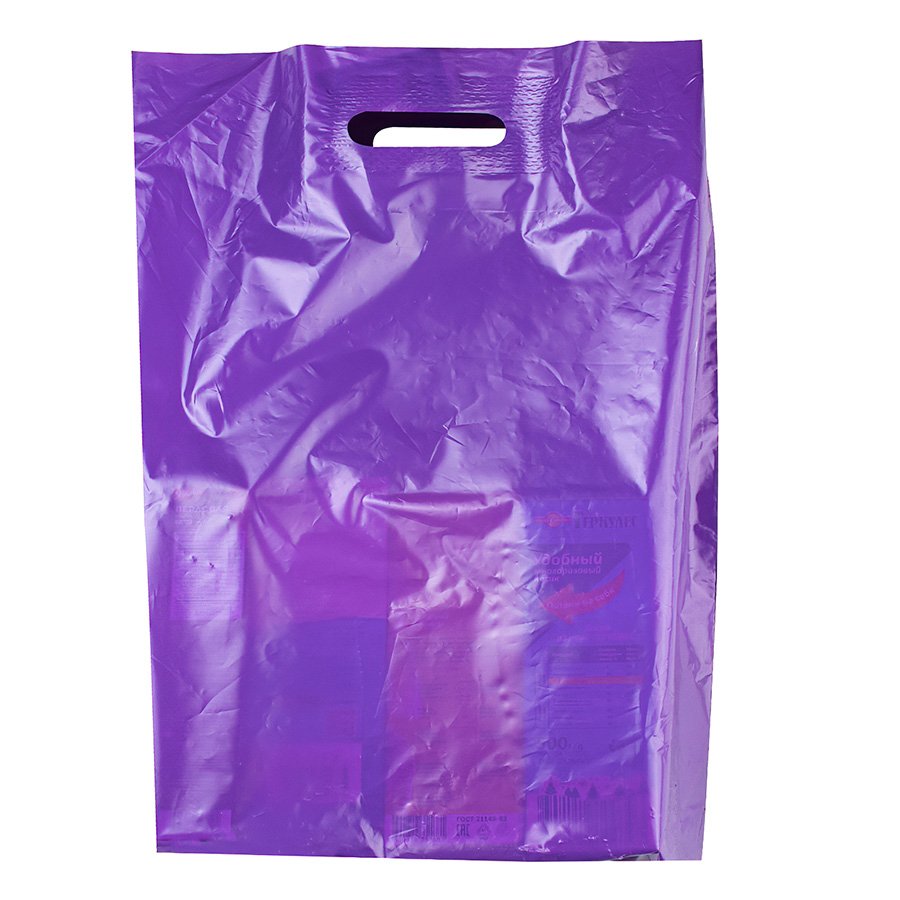 - Пакеты фиолетового цвета из материала ПВД с вырубной ручкой, 40x50 см, толщиной 50 мкм, донная складка - 4 см.