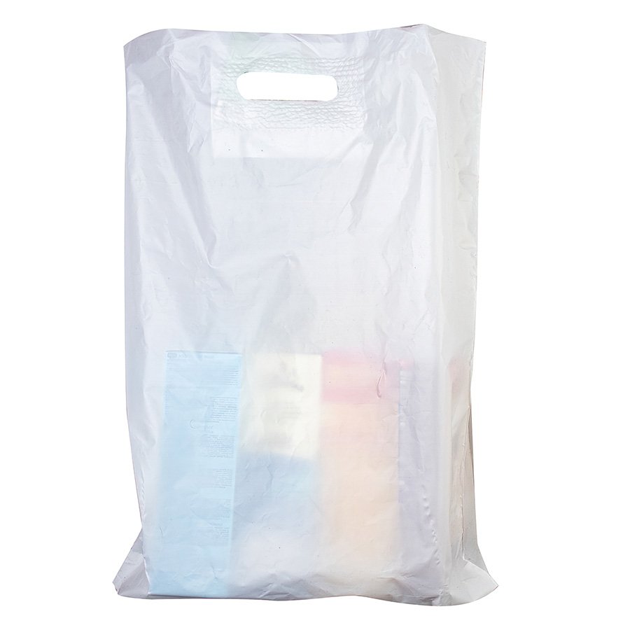 - Пакеты белого цвета из материала ПНД с вырубной ручкой, 40x50 см, толщиной 50 мкм, донная складка - 3 см.