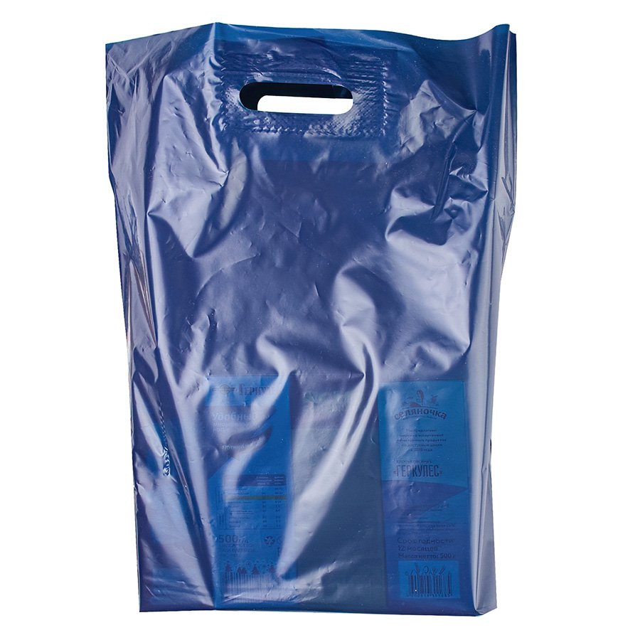- Пакеты темно-синего цвета из материала ПВД с вырубной ручкой, 40x50 см, толщиной 60 мкм, донная складка - 3 см.