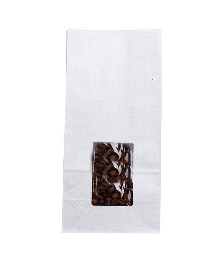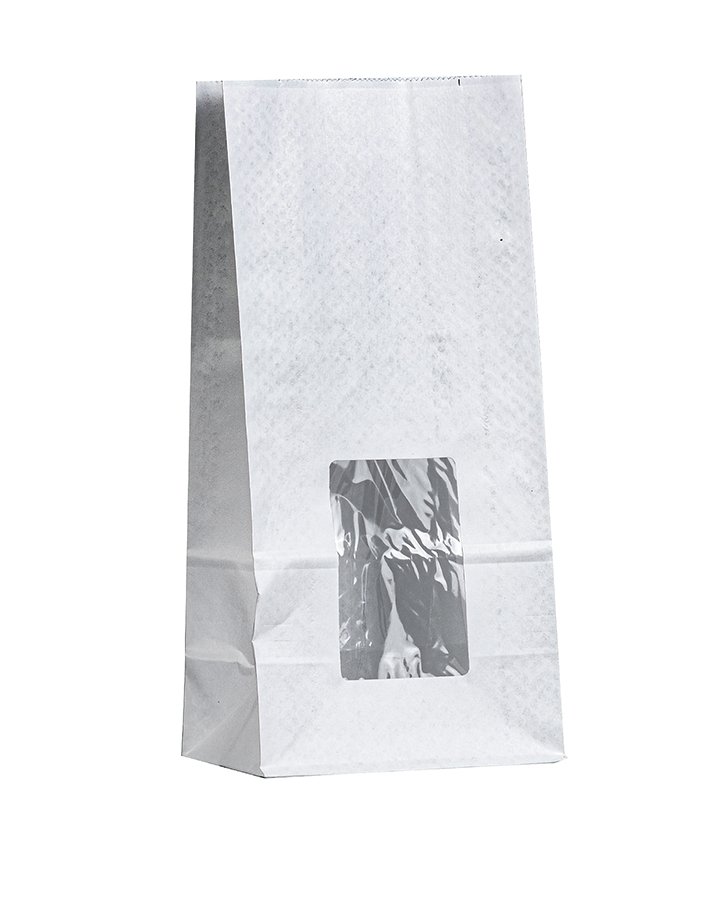 • Двухслойные белые крафт пакеты 120x80x250 мм с окном используются для упаковки чая, кофе, какао, сладостей, орехов и других сыпучих продуктов.