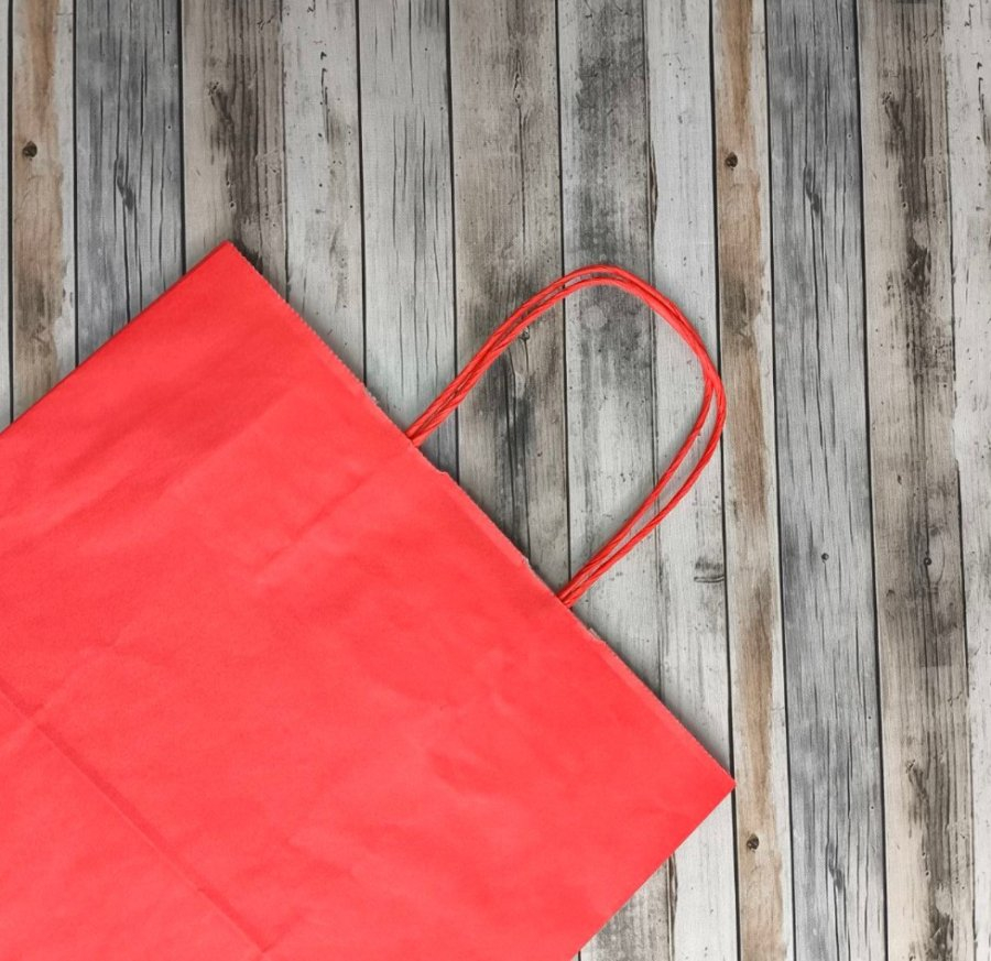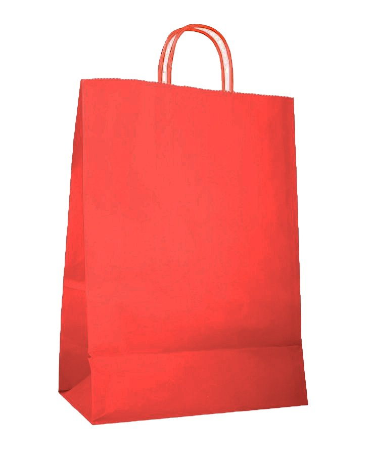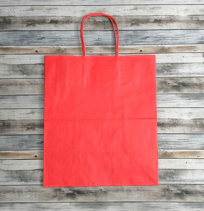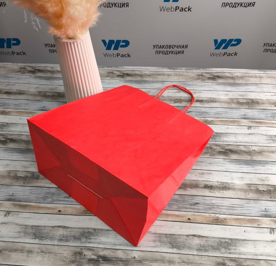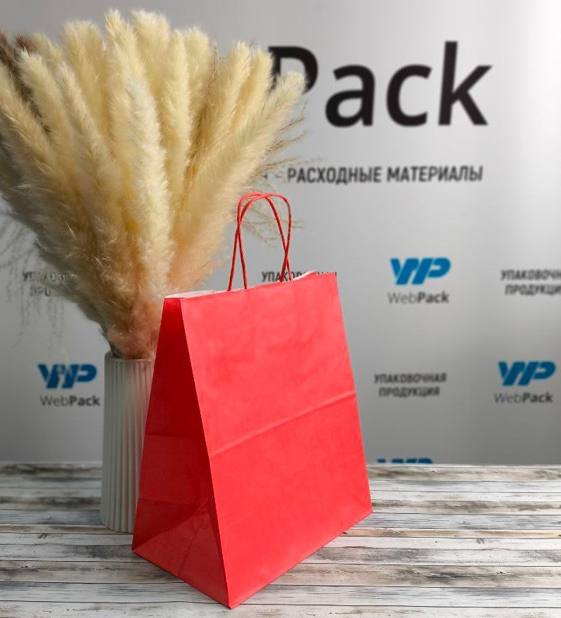 - Бумажные крафт пакеты красного цвета с кручеными ручками, размер 24x14x28 см.