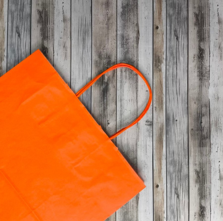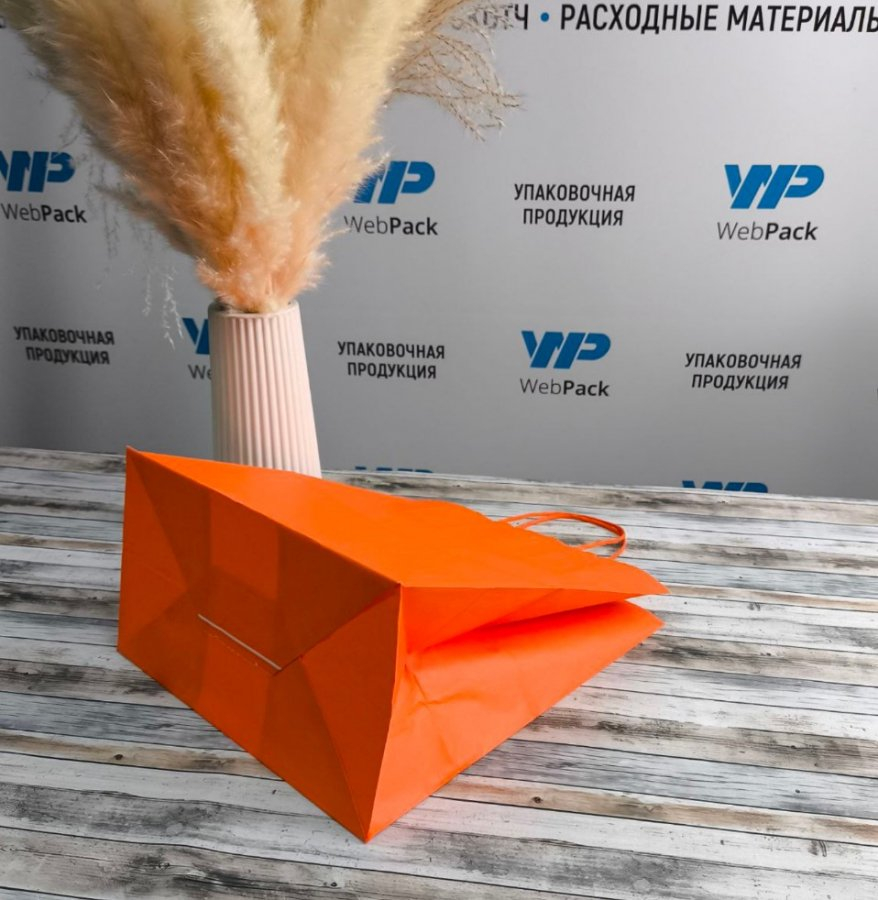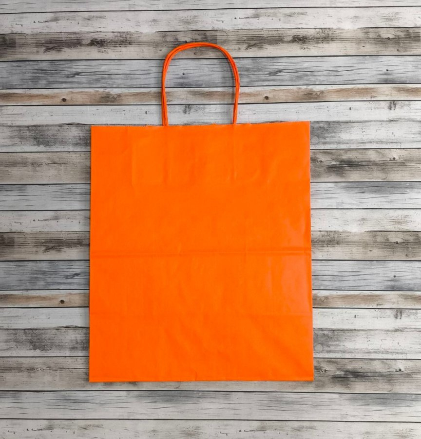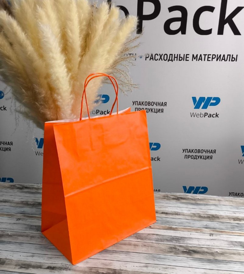 • Бумажные крафт пакеты оранжевого цвета с кручеными ручками, размер 24x14x28 см.