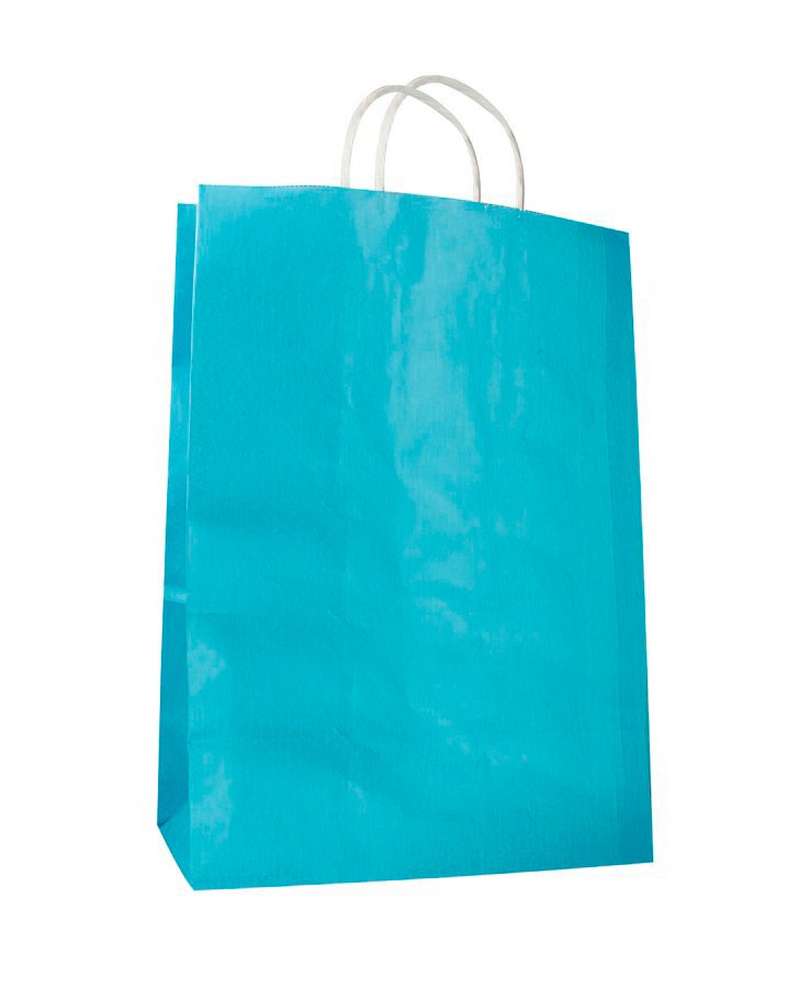 - Бумажные крафт пакеты голубого цвета с кручеными ручками, размер 25x11x32 см.