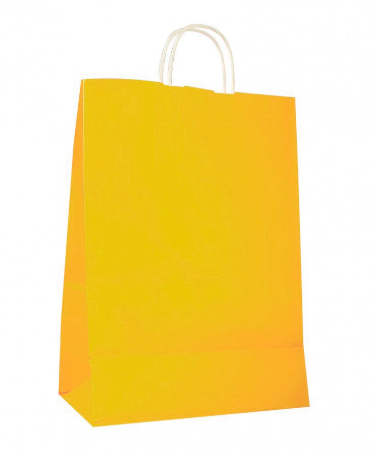 • Бумажные крафт пакеты желтого цвета с кручеными ручками, размер 25x11x32 см.