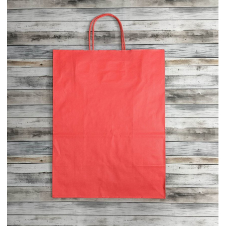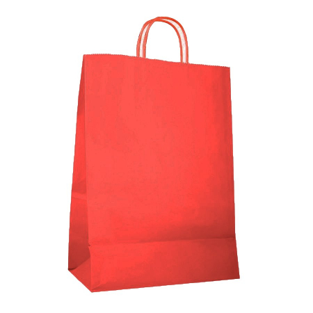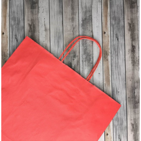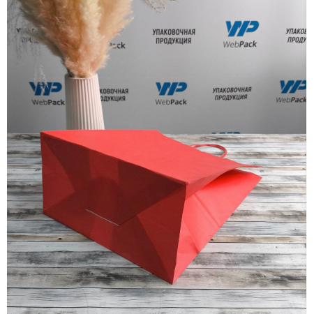 • Бумажные крафт пакеты красного цвета с кручеными ручками, размер 26x15x35 см.