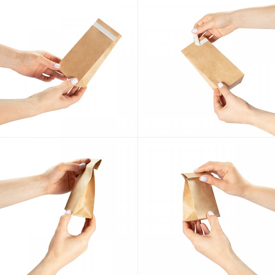- Благодаря прямоугольному дну, крафт-пакеты можно ставить вертикально (например, на полку в супермаркете или в шкафу).