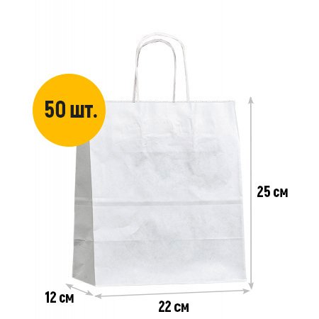 - Крафт пакеты белого цвета с кручеными ручками 220x120x250 мм - универсальные в применении, подходят для упаковки одежды, аксессуаров, подарков, продуктов и др.