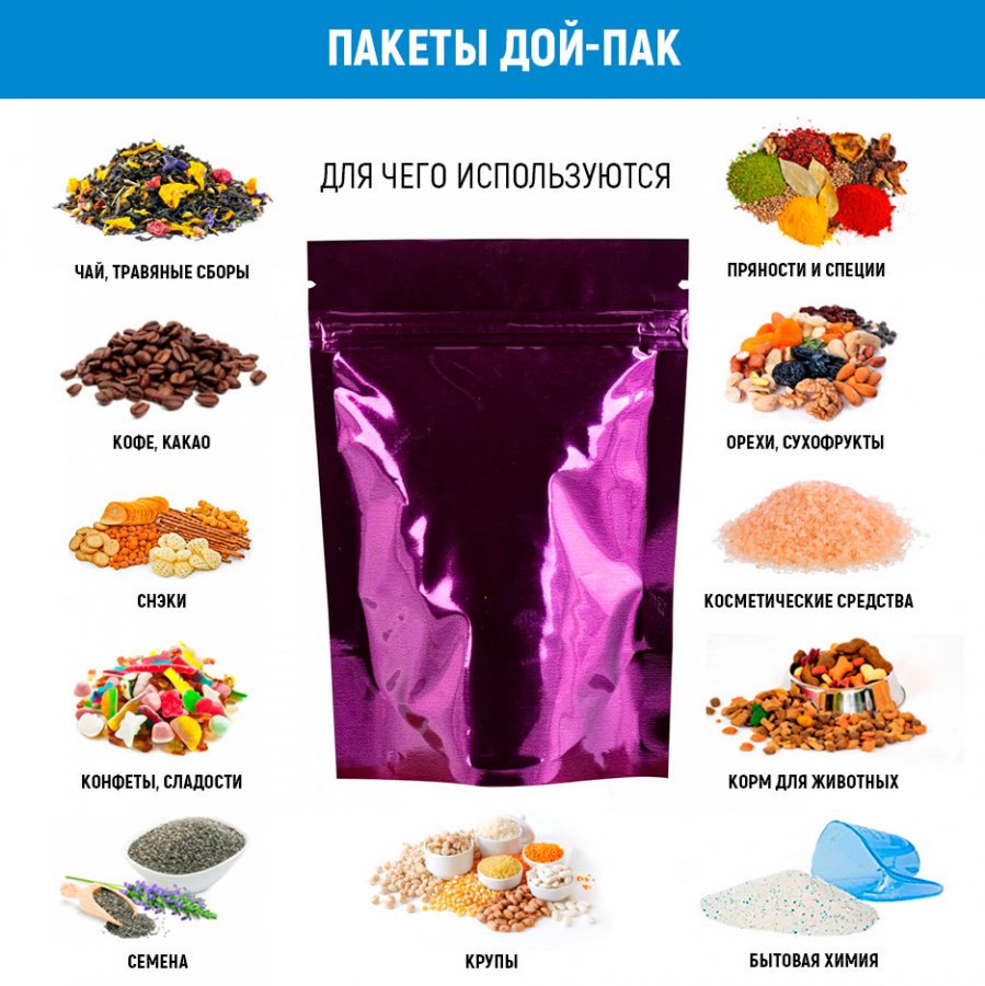 • Пакеты дой-пак фиолетового цвета, размер 105*150(+30)мм, применяются для упаковки и хранения сыпучей продукции (кофе, чай, крупа, специи, орехи, сухофрукты, сладости, снэки, морская соль, скраб для тела, бытовая химия, корм для животных и др.).