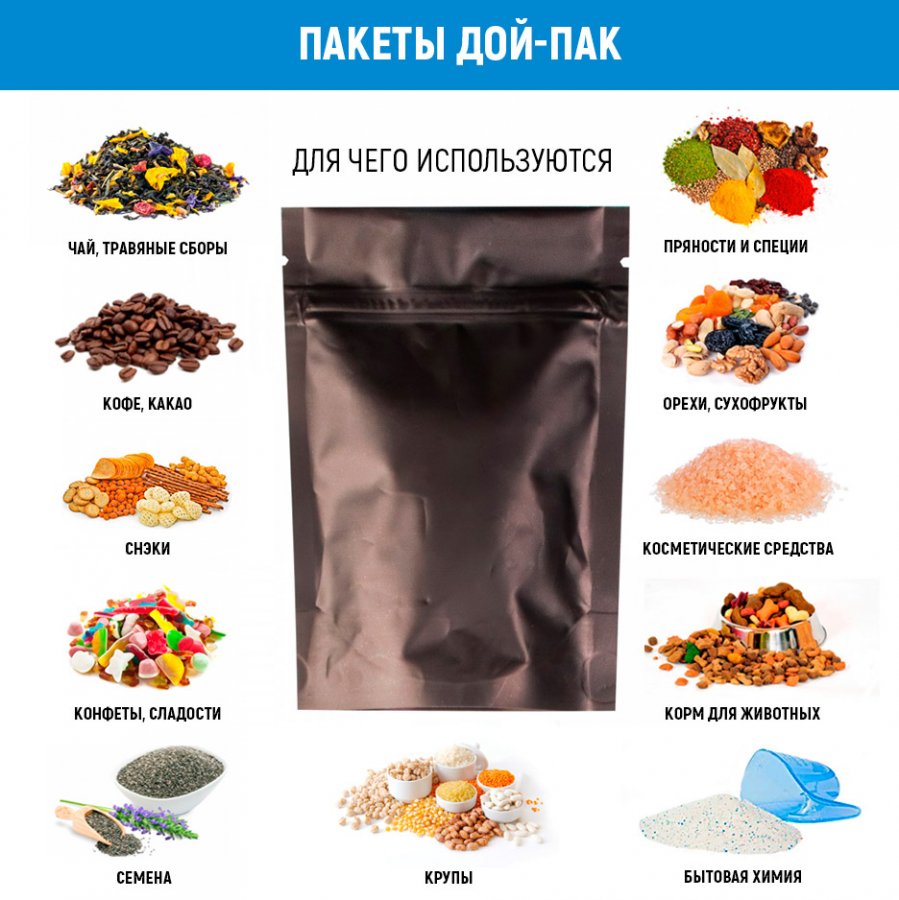 Матовые пакеты дой-пак размер 10,5 x 15 см, цвет темно-коричневый.