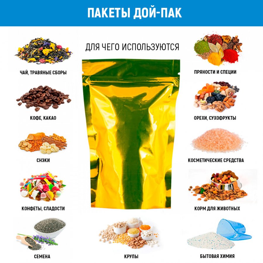 - Пакеты дой-пак золотистого цвета, размер 135*200(+40)мм, применяются для упаковки и хранения сыпучей продукции (кофе, чай, крупа, специи, орехи, сухофрукты, сладости, снэки, морская соль, скраб для тела, бытовая химия, корм для животных и др.).