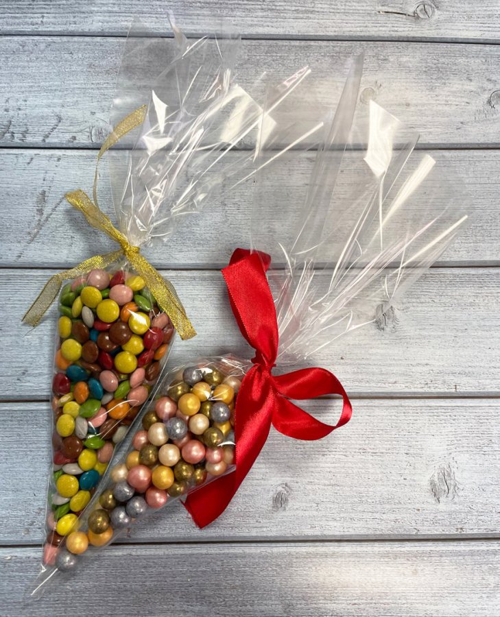 БОПП-пакеты в форме конуса 20x35 см отлично подходят для фасовки сыпучих продуктов (конфет, кофе, чая, сладостей), а также для декоративной и подарочной упаковки.