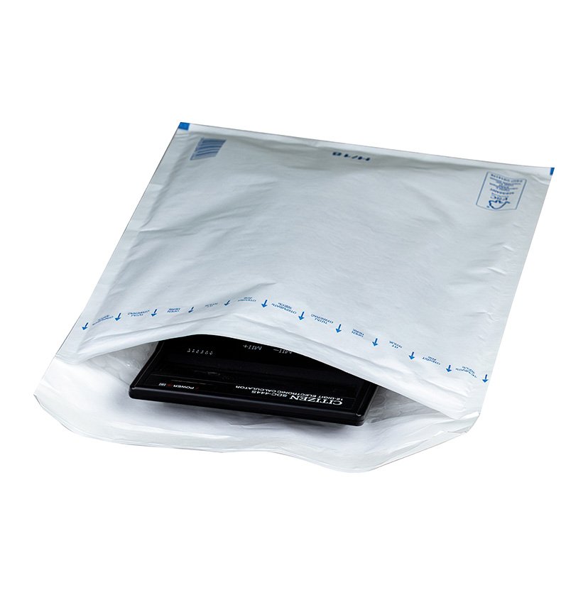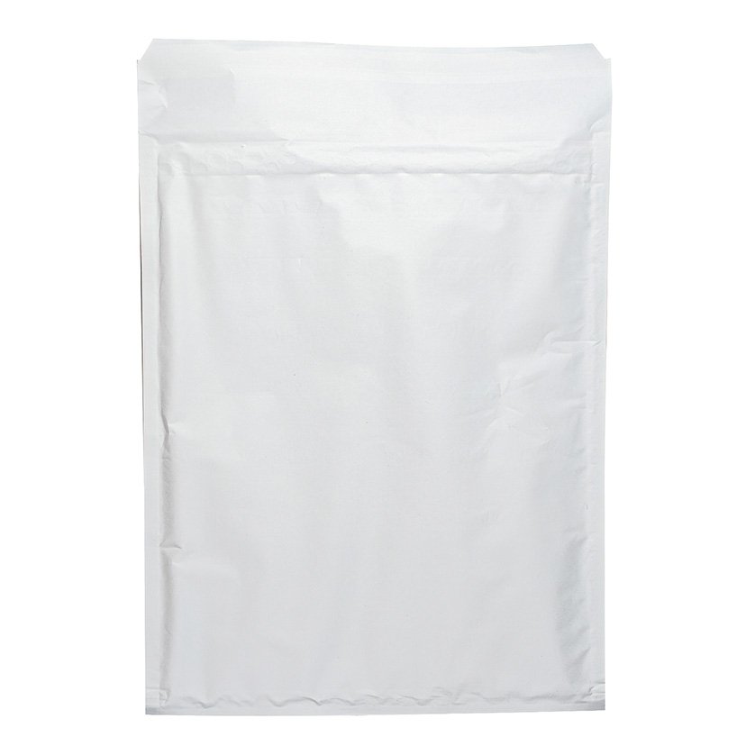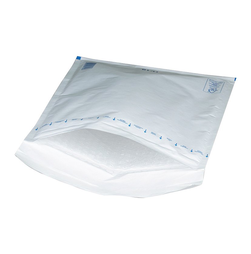Пакет с воздушной подушкой внутри, белая бумага снаружи, на клапане отрывная лента.