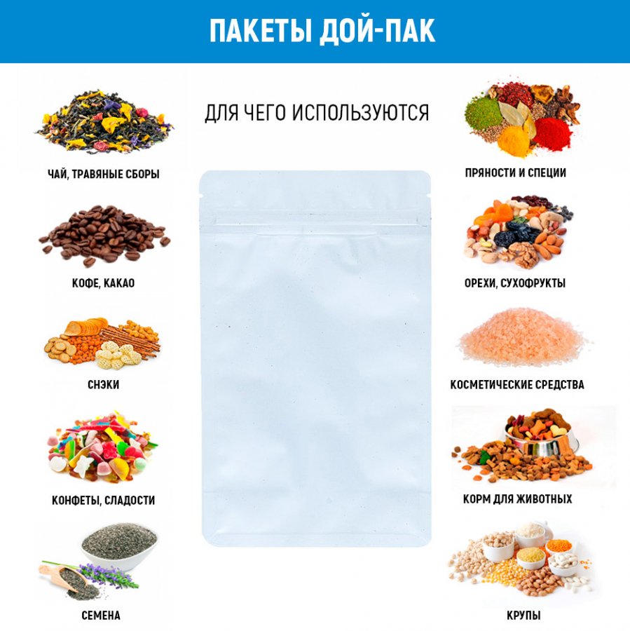 - Подходят для фасовки и хранения мелкой и сыпучей продукции (чай и травяные сборы, кофе, специи, орехи, сухофрукты, сладости, различные снэки, корма для животных и др.)