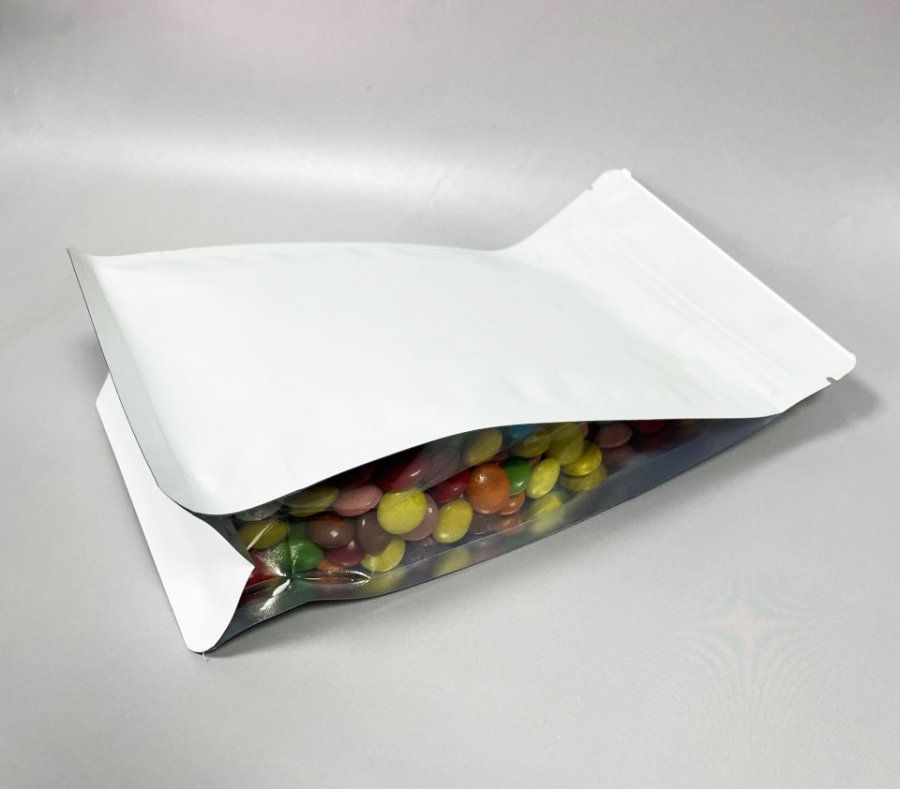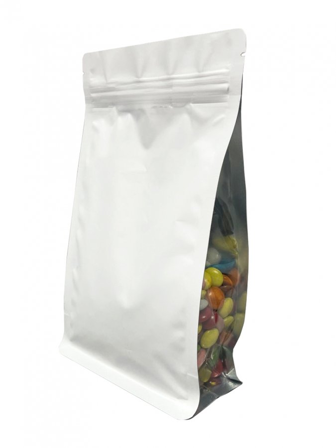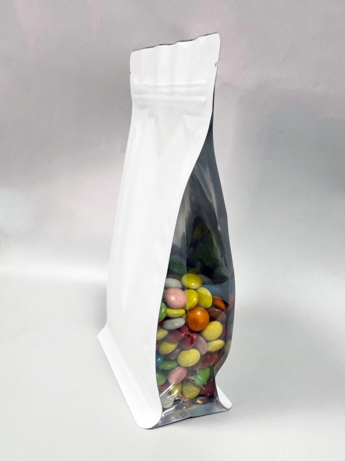Пакет восьмишовный с плоским дном белый матовый с замком зип лок и прозрачными фальцами 135+65х225