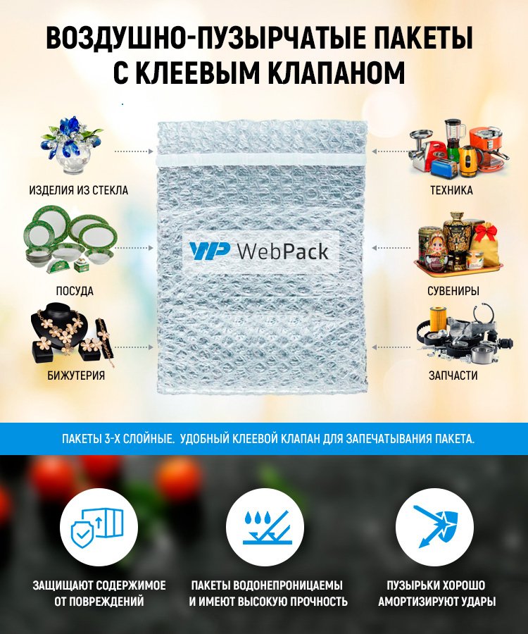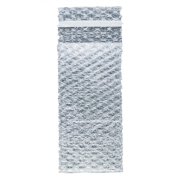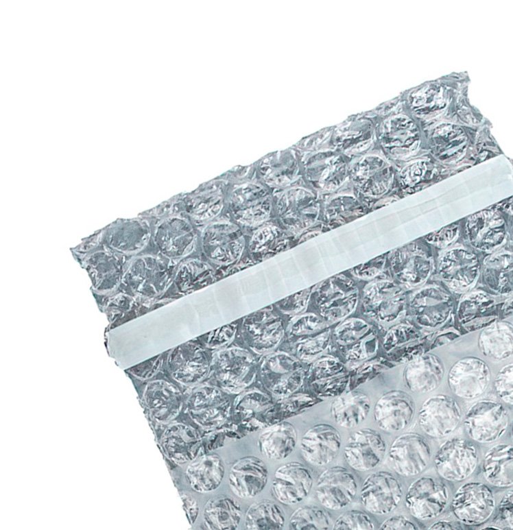 - Воздушно-пузырчатые пакеты с клеевым клапаном, состоящие из трёх слоев (полиэтилен + слой с пузырьками + полиэтилен), 10x24 см + 5 см клапан.
