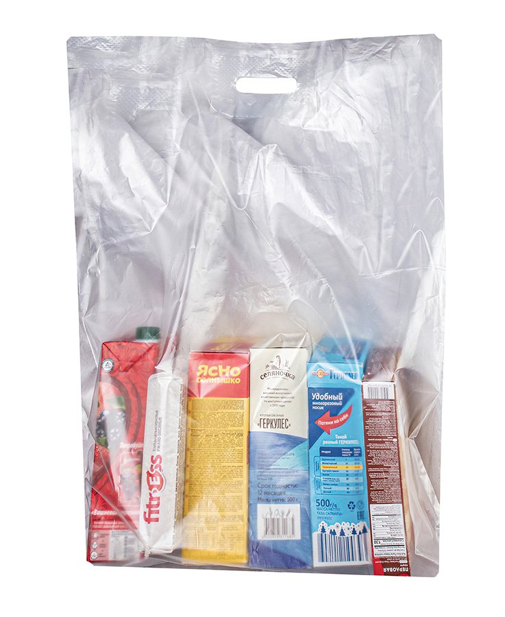 - Прозрачные пакеты из материала ПВД с вырубной ручкой, 50x60 см, толщиной 60 мкм, донная складка - 4 см.