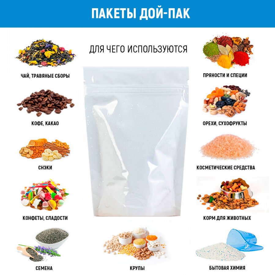 • Пакеты дой-пак белого цвета, размер 105*150(+30)мм, применяются для упаковки и хранения сыпучей продукции (кофе, чай, крупа, специи, орехи, сухофрукты, сладости, снэки, морская соль, скраб для тела, бытовая химия, корм для животных и др.).