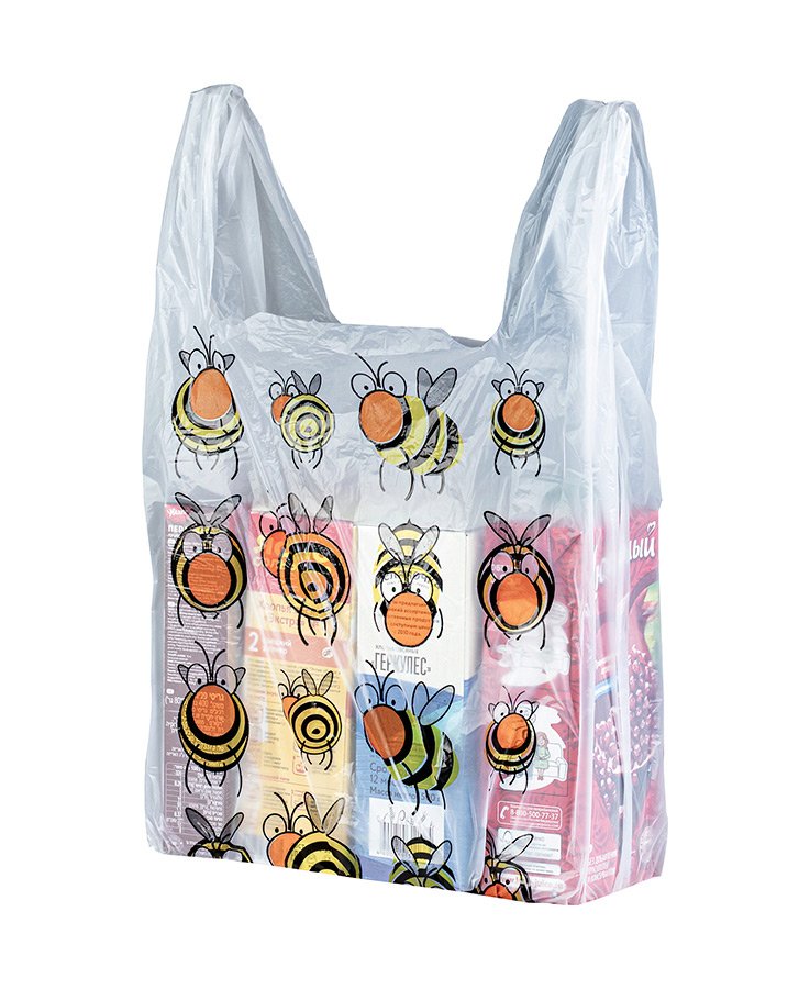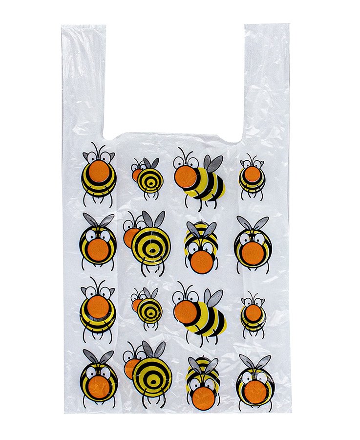 Пакеты-майка с рисунком "Пчелки", размер 27x50 см, толщина 15 мкм. Есть боковые фальцы. Используются в магазинах и супермакетах для упаковки различных товаров (одежды, обуви, техники, канцелярии и др.).