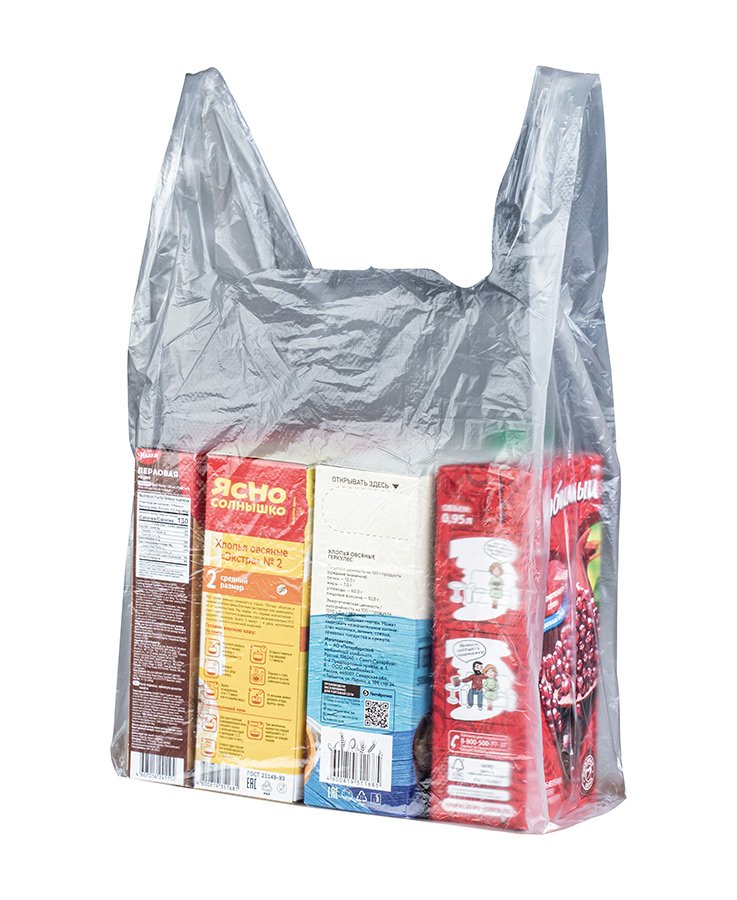 Пакеты-майка прозрачные, размер 28x49 см, толщина 13 мкм. Есть боковые фальцы. Используются в магазинах и супермакетах для упаковки различных товаров (одежды, обуви, техники, канцелярии и др.).