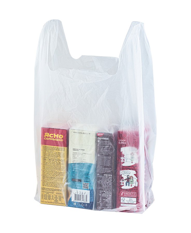 Пакеты-майка белого цвета, размер 29x53 см, толщина 12 мкм. Есть боковые фальцы. Используются в магазинах и супермакетах для упаковки различных товаров (одежды, обуви, техники, канцелярии и др.).