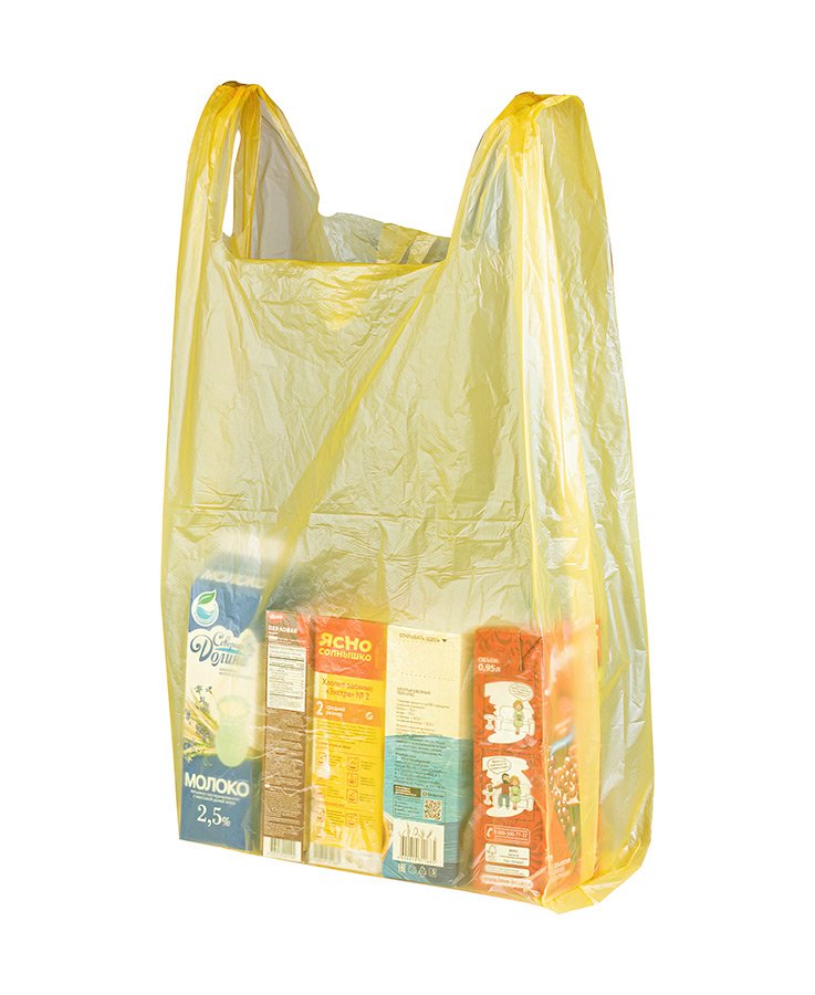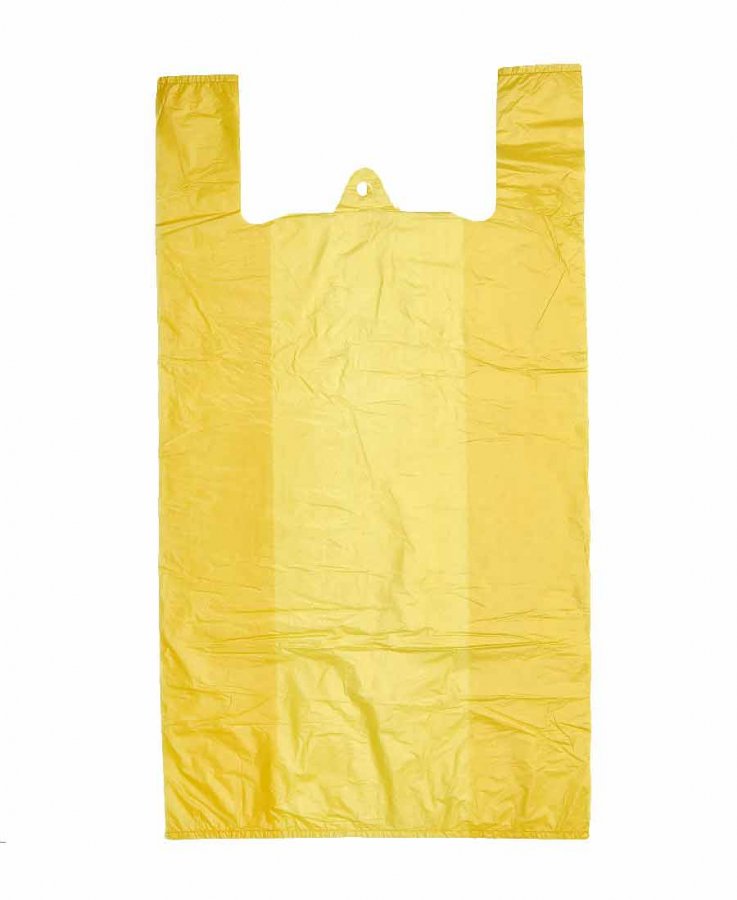 Пакеты-майка желтого цвета, размер 42x70 см, толщина 25 мкм. Есть боковые фальцы. Используются в магазинах и супермакетах для упаковки различных товаров (одежды, обуви, техники, канцелярии и др.).