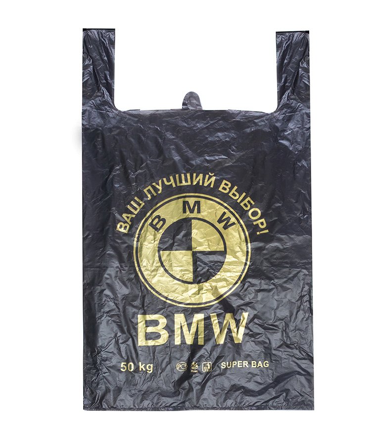 Пакеты-майка с рисуном "BMW", размер 43x60 см, толщина 35 мкм. Есть боковые фальцы. Используются в магазинах и супермакетах для упаковки различных товаров (одежды, обуви, техники, канцелярии и др.).