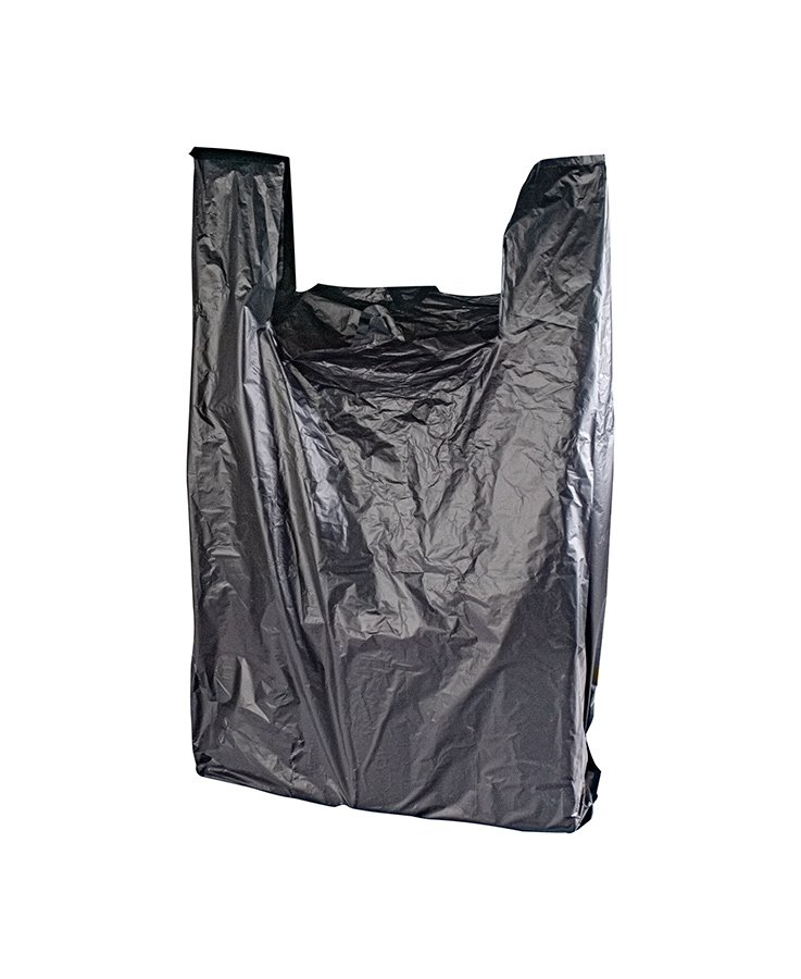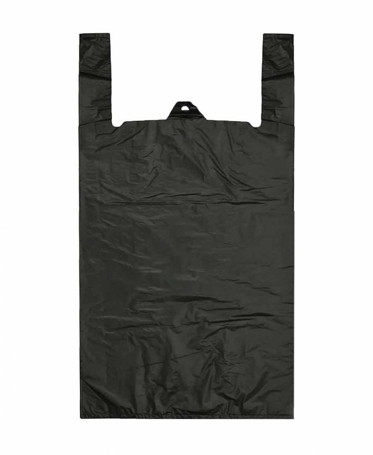 Пакеты-майка черного цвета, размер 41x70 см, толщина 23 мкм. Есть боковые фальцы. Используются в магазинах и супермакетах для упаковки различных товаров (одежды, обуви, техники, канцелярии и др.).