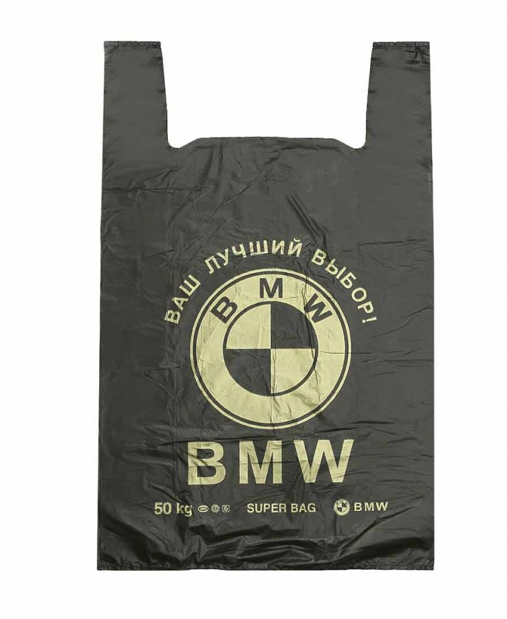 Пакеты-майка с рисунком "BMW", размер 40x65 см, толщина 21 мкм. Есть боковые фальцы. Используются в магазинах и супермакетах для упаковки различных товаров (одежды, обуви, техники, канцелярии и др.).