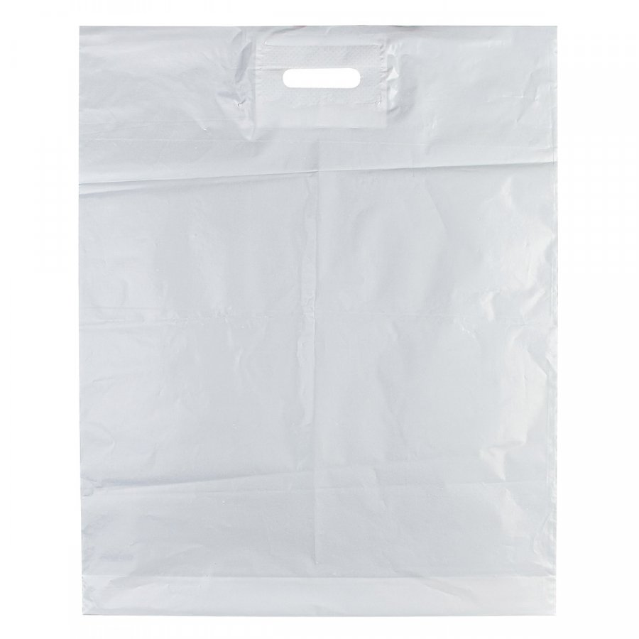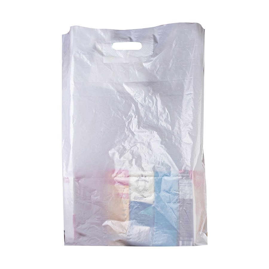 - Пакеты белого цвета из материала ПВД с вырубной ручкой, 50x60 см, толщиной 60 мкм, донная складка - 4 см.