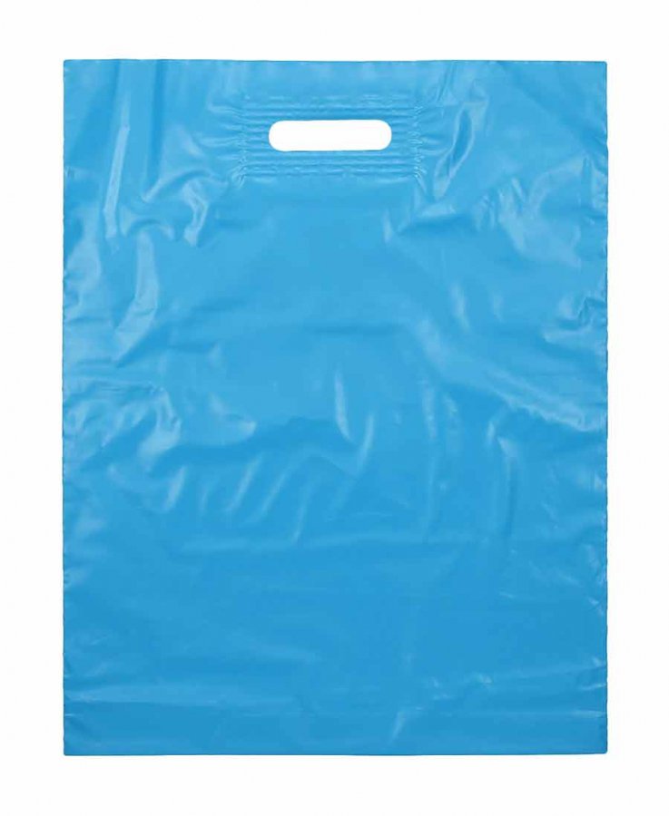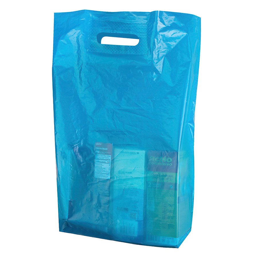 - Пакеты голубого цвета из материала ПВД с вырубной ручкой, 40x50 см, толщиной 50 мкм, донная складка - 3 см.