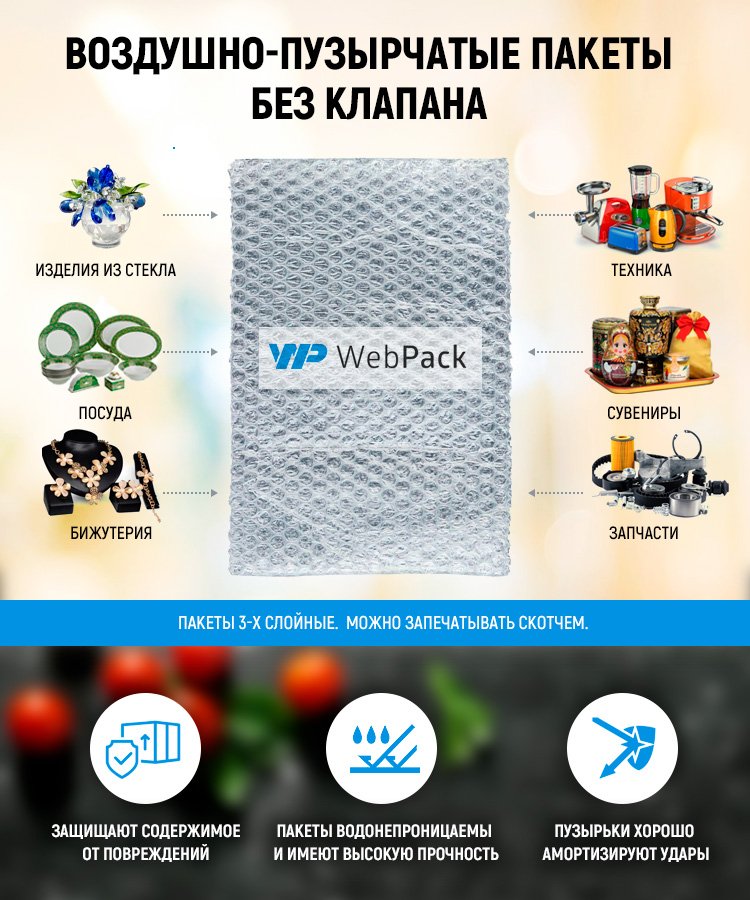 - Воздушно-пузырчатые пакеты, состоящие из трёх слоев (полиэтилен + слой с пузырьками + полиэтилен), 25x40 см.