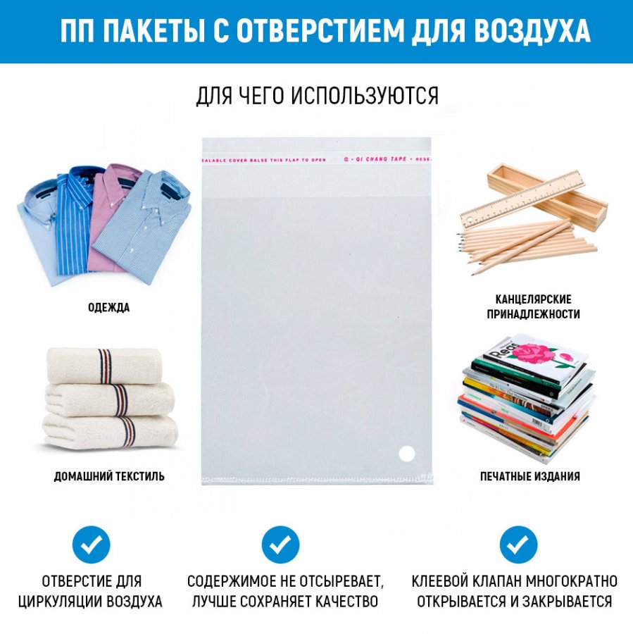 - Полипропиленовые пакеты 22x30 см с клеевым клапаном и отверстием для воздуха - удобное и практичное решение для упаковки самых разных товаров.