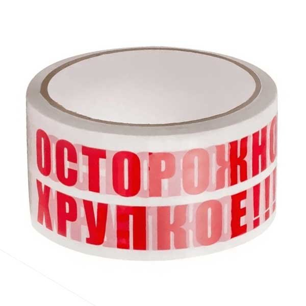 • Скотч белого цвета с красной надписью "Осторожно хрупкое" - ширина 48 мм, длина 36 м, толщина 50 мкм.