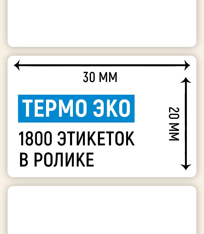 - Белые термоэтикетки ЭКО 30x20 мм на самоклеящейся основе используются для маркировки продукции, не подлежащей длительному хранению.