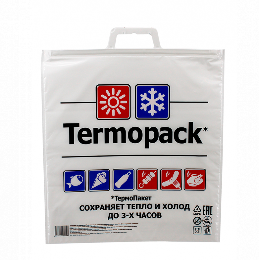 • Трехслойные термопакеты Эконом 42х45 см, вместимостью до 15 литров, предназначены для доставки и сохранения замороженных, охлажденных и горячих продуктов.