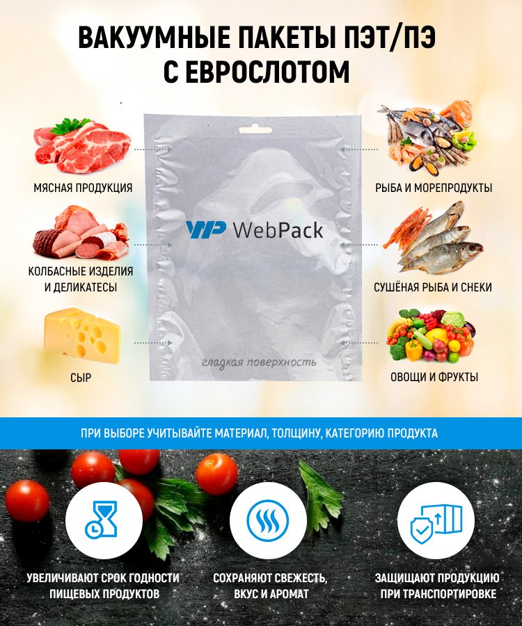 - Материал ПЭТ/ПЭ подходит для вакуумной упаковки и фасовки свежих и замороженных пищевых продуктов, готовых блюд с коротким сроком годности; мяса, рыбы, фруктов, овощей; для деликатесов из рыбы, копченых колбас; твердых сыров и брынзы; для снеков.